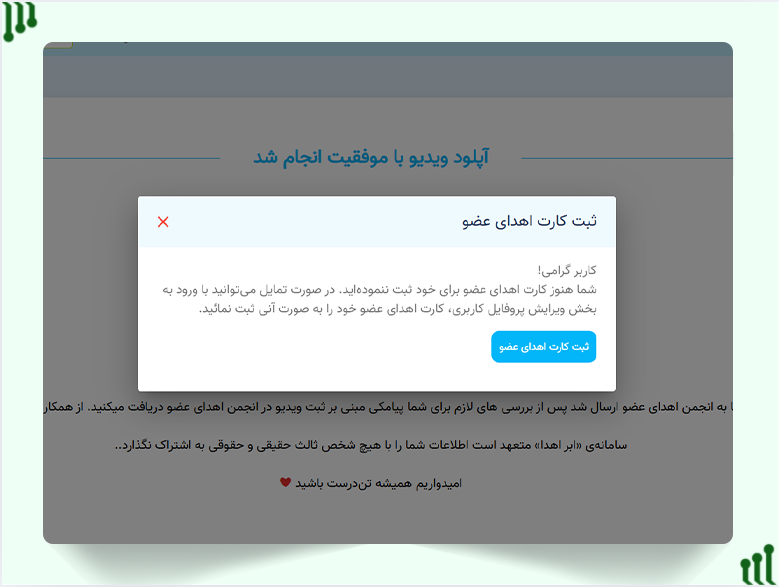 - در صورتی که آپلود ویدئو با موفقیت صورت گیرد، کارت اهدا عضو صادر می گردد.