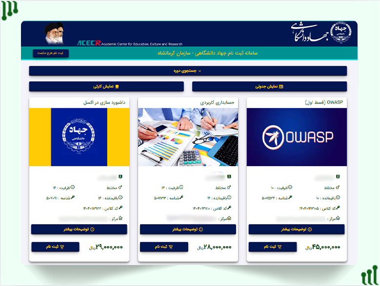 - روی نام دورهای که مایل هستید ثبتنام کنید کلیک کنید تا جزئیات کامل شامل شهریه، مدت زمان، محل برگزاری، ظرفیت و شرایط شرکتکنندگان نمایش داده شود.